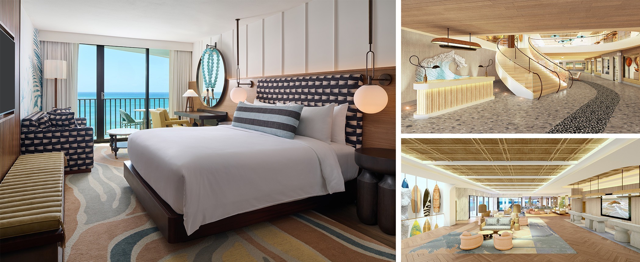(L–R) Reimagined Guestroom with Oceanfront Views; Arrival Experience Inspired by the Flow of ʻĀpuakēhau Stream; Open-Air Lobby Designed to Frame Waikīkī’s Shoreline | Download images/renderings HERE